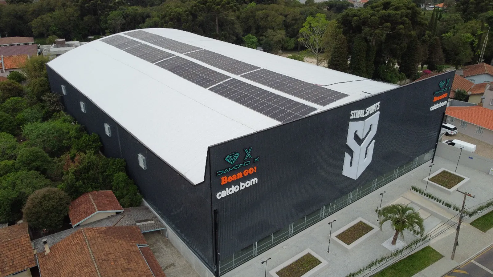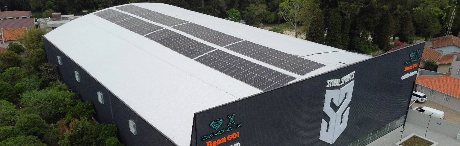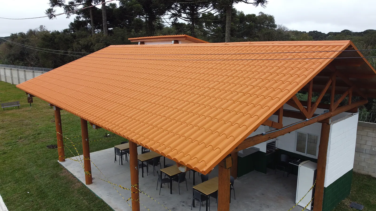 Uma das maiores quadras de futebol em grama sintética do Paraná, onde foram utilizados mais de 5800m² de telhas metálicas com isolamento térmico para melhor controle da temperatura interna.