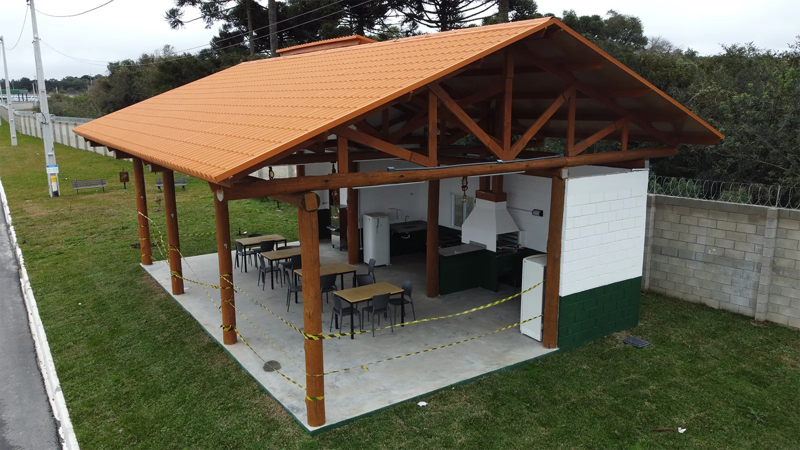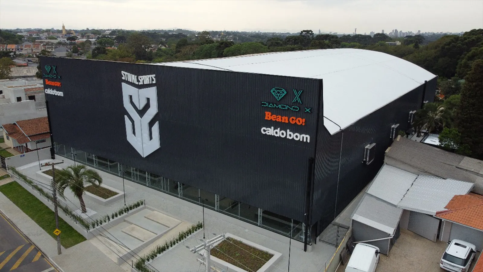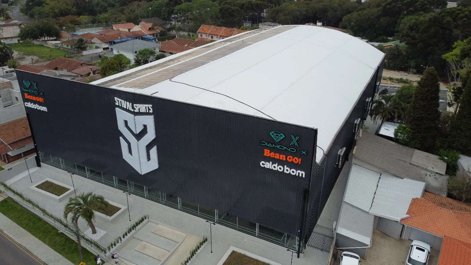 Uma das maiores quadras de futebol em grama sintética do Paraná, onde foram utilizados mais de 5800m² de telhas metálicas com isolamento térmico para melhor controle da temperatura interna.